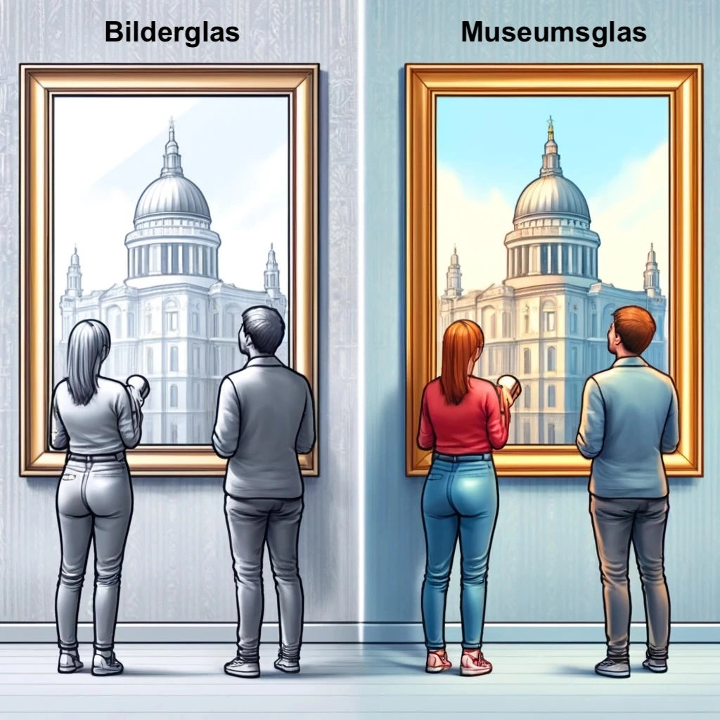 Entscheiden Sie sich zwischen klassischem Bilderglas und dem hochwertigen, UV-schützenden, nicht spiegelnden Museumsglas.