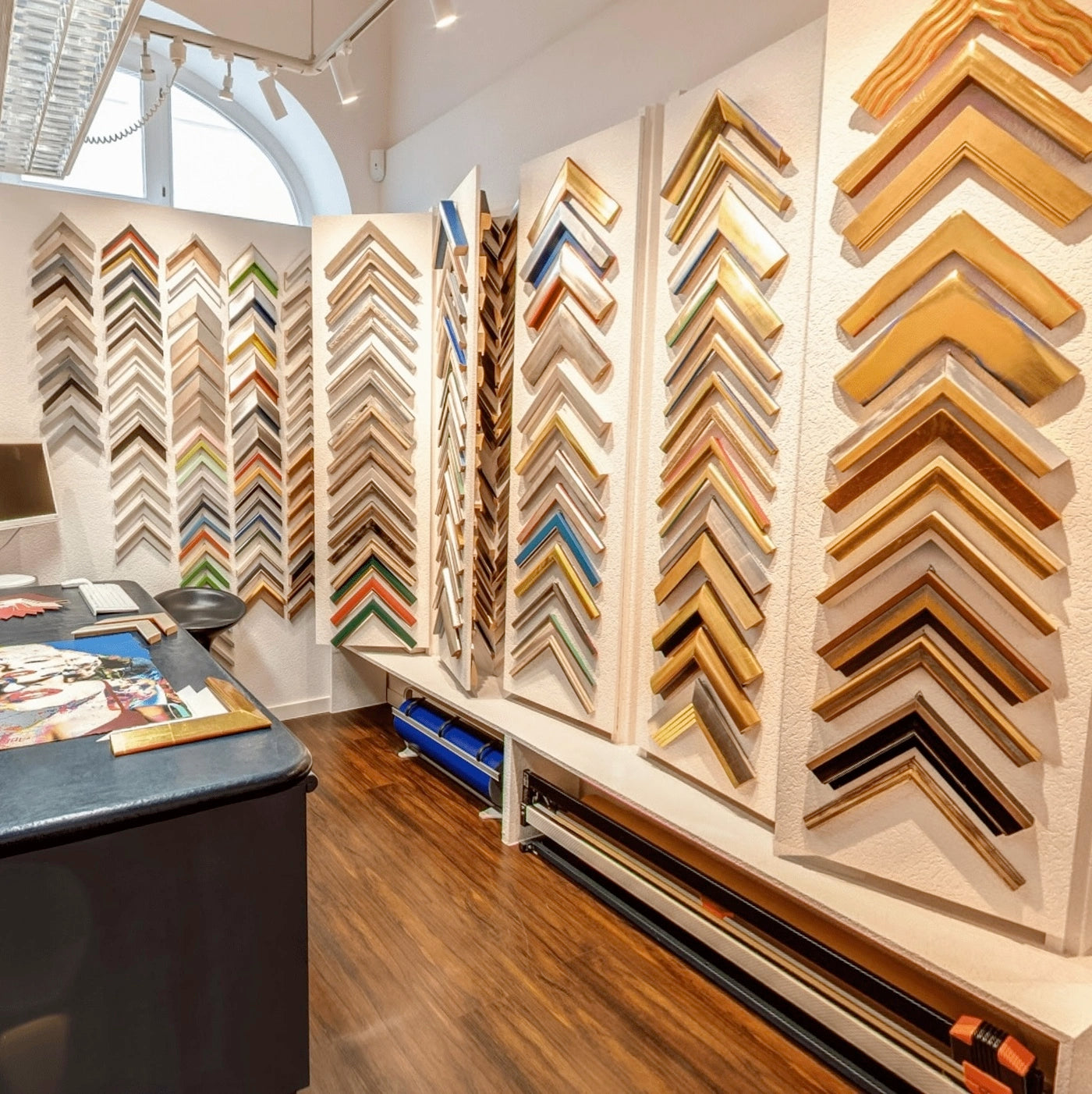 Besuchen Sie uns und entdecken Sie die große Auswahl an Rahmen, die wir für Sie bereithalten. Von edlem Echtgold über stilvolle Atelierrahmen bis hin zu farbenfrohen Rahmen und Folienvergoldungen - wir haben für jeden Geschmack etwas dabei.